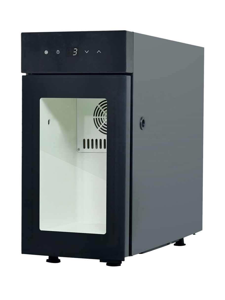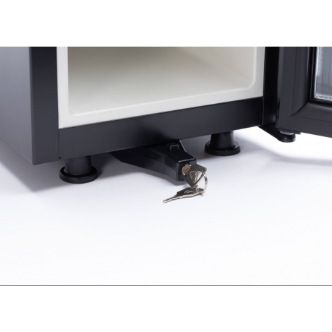 Строгий чёрный корпус и аккуратная стеклянная дверца с замком органично смотрятся в клиентской зоне и защищают продукт от несанкционированного доступа.