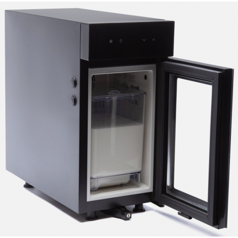 Внутри устанавливается стандартный контейнер для молока объёмом 4,5 л (общий полезный объём камеры около 8,5 л), чего достаточно для полноценной загрузки офисной точки, кофейного уголка в отеле или кофебара на стойке ресепшн.